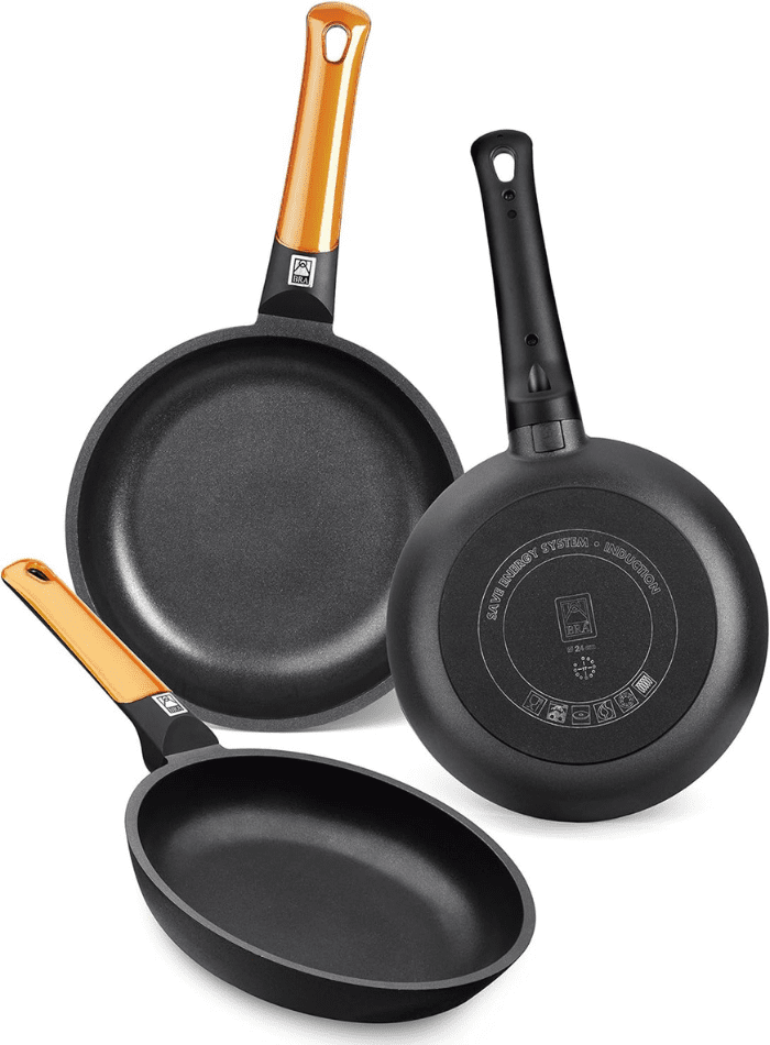 - Incluye: 3 sartenes de 6 mm de espesor (18-22-26 cm) con mango ergonómico Efficient Orange