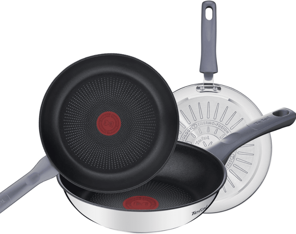 - Thermo-Fusion+ ofrece un calentamiento rápido y uniforme de toda la sartén, para cocinar los alimentos de forma homogénea y óptima gracias a su amplia superficie y su gruesa base